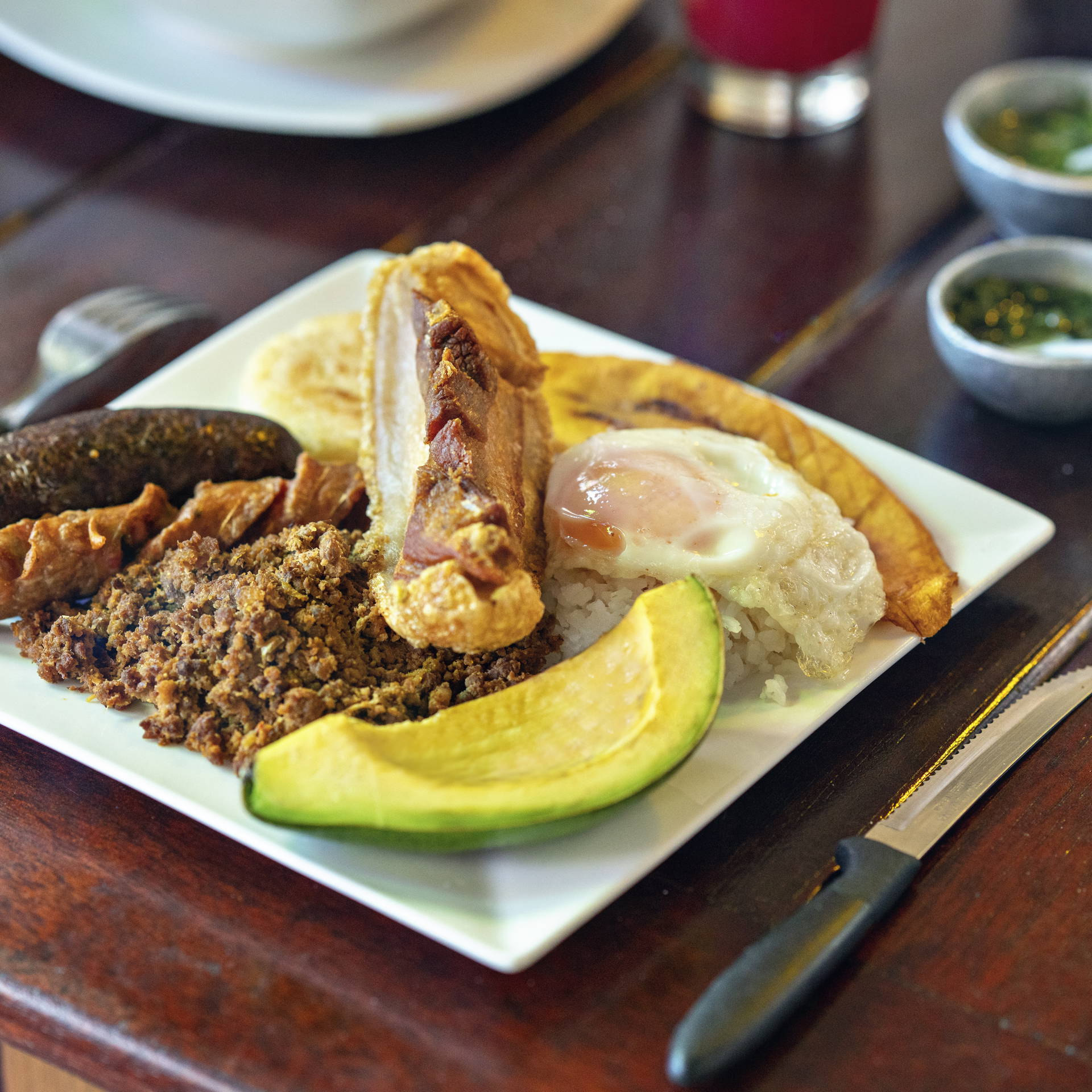 Taki zestaw zawiera więc fasolę, ryż, mielone mięso, smażoną wołowinę, podsmażoną na suchej patelni kiełbasę chorizo, jajko sadzone, plantany i oczywiście – awokado. Każdy składnik ma tu swoją rolę – fasola i ryż dostarczają energii, mięso białka, a awokado i plantany równoważą tłuste dodatki.