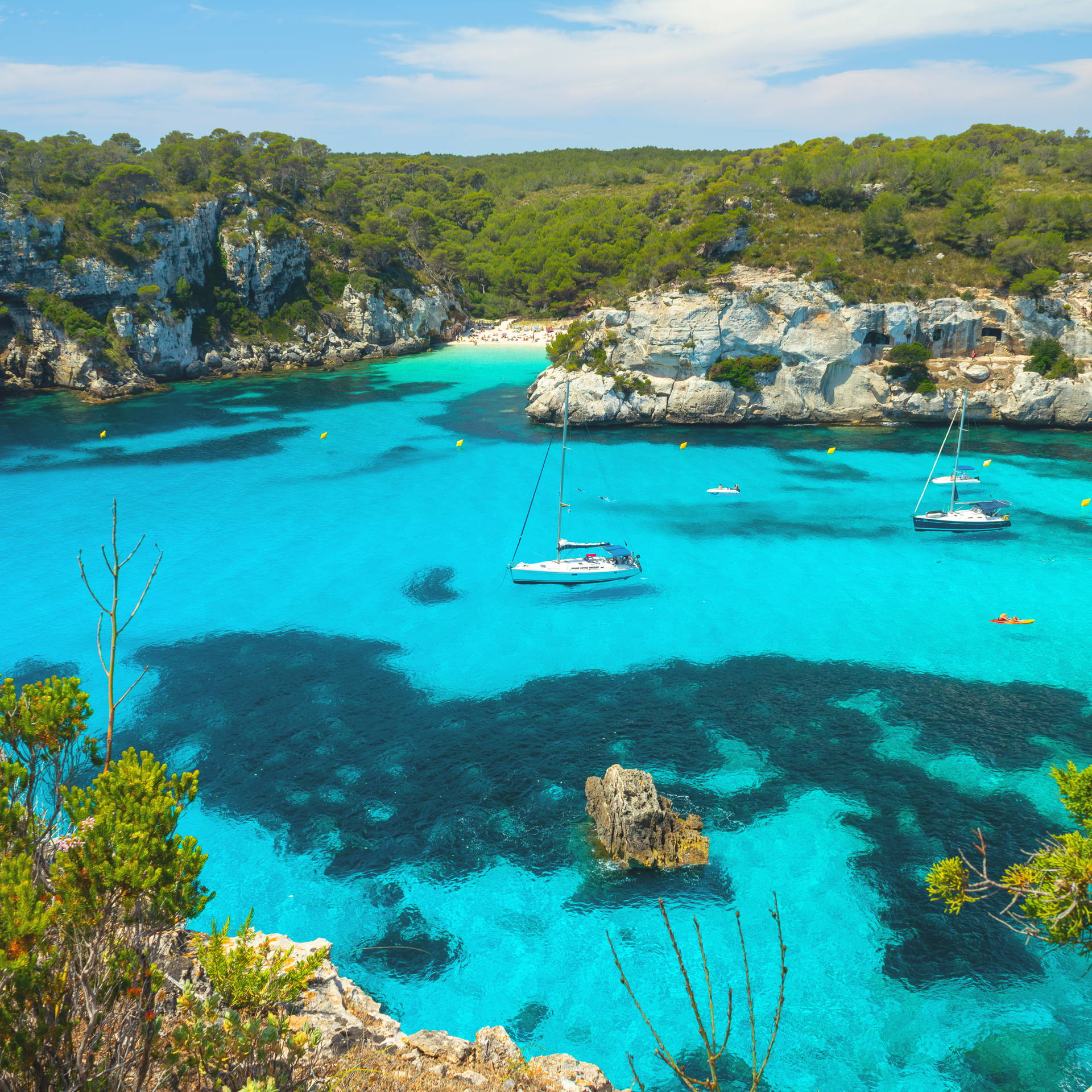 Biały piasek i krystalicznie czysta, turkusowa woda wyglądają jak z pocztówki – to jeden z najbardziej ikonicznych widoków Balearów. Dostęp prowadzi dwoma drogami: spacer z parkingu przez sosnowy las (około 20 minut) lub łodzią z Ciutadelli czy pobliskiej Cala Galdana.