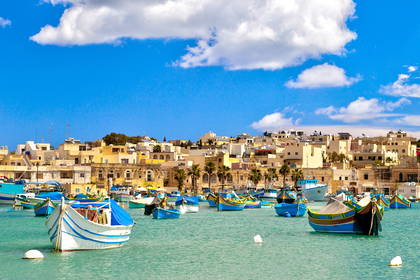 Marsaxlokk – malownicza wioska rybacka z kolorowymi łodziami i niedzielnym targiem.