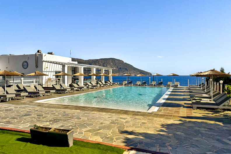 Hotel o kameralnym charakterze, położony w cichej okolicy w pobliżu Pigadii. Idealna propozycja dla osób ceniących widoki, prywatność i wypoczynek z dala od tłumów. Układ obiektu, z osobnymi wejściami do apartamentów i brakiem wspólnych korytarzy, zapewnia większą prywatność niż typowe hotele sieciowe. Dzięki udogodnieniom wellness oraz tarasowemu położeniu z widokiem na morze może przypaść do gustu szczególnie parom i osobom dorosłym.