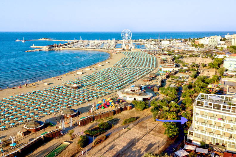 - Hotel znajduje się w dzielnicy San Giuliano Mare, tuż przy nowej marinie (Darsena di Rimini). Jest to odnowiona, elegancka część miasta. Od historycznego centrum Rimini i Mostu Tyberiusza dzieli go około 1,5–2 km (przyjemny spacer). Aby dostać się do głównej dzielnicy rozrywkowej Marina Centro, trzeba przejść przez most lub skorzystać z lokalnego promu (w sezonie).