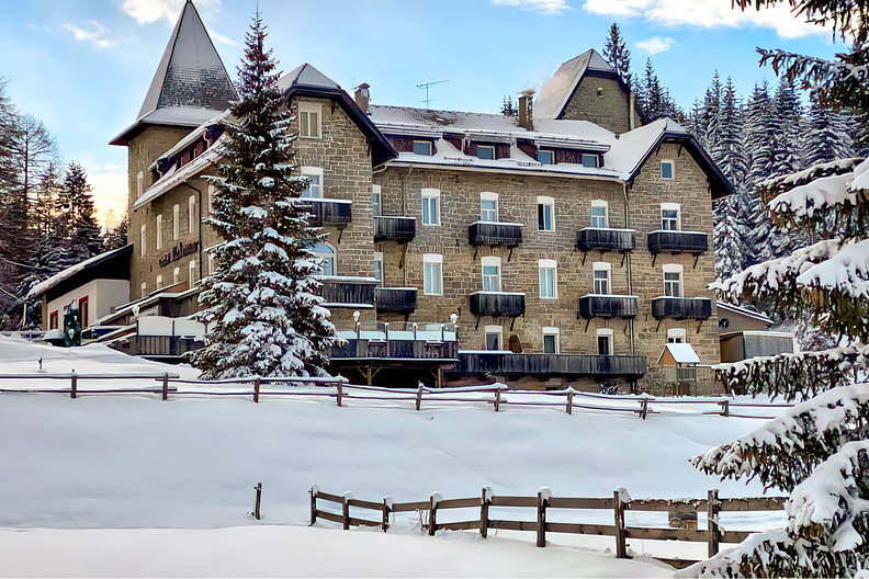 - Hotel znajduje się bezpośrednio przy stokach narciarskich, otoczony pasmami górskimi Latemar i Rosengarten.